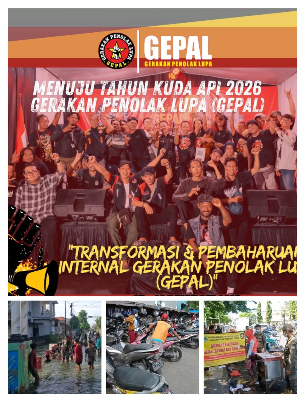 Gresik – Menjelang pergantian tahun 2025, lembaga swadaya masyarakat (LSM) Gerakan Penolak Lupa alias Gepal mengadakan serangkaian kegiatan sosial dan refleksi akhir tahun di salah-satu bilangan di Jawa Timur, Wonosalam, Jombang, yang diakhiri dengan renungan kebangsaan di Markas Besar mereka, Gresik, Jatim.